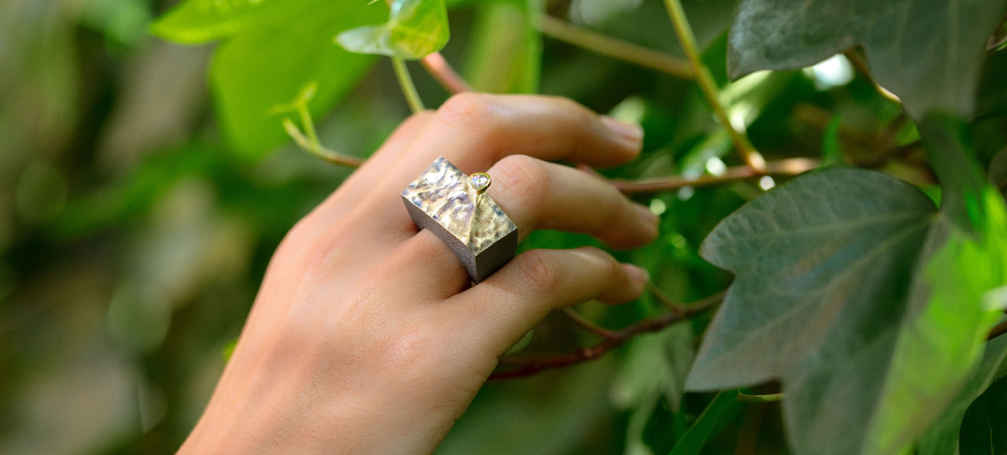 Los anillos de diseño originales que elaboramos tienen una estética muy cuidada, que a menudo nace de la observación de la naturaleza o de procesos escultóricos. Esto da como resultado formas únicas que conectan con quien las lleva.
