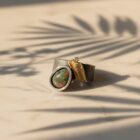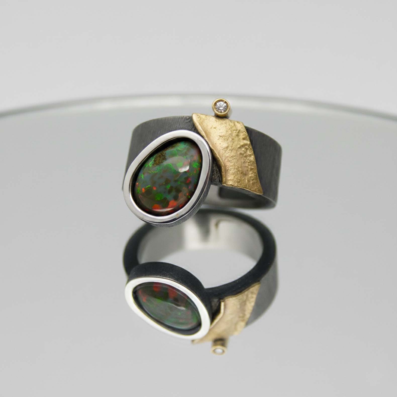 La naturaleza a veces nos sorprende con un magnífico ópalo etíope multicolor; la plata, el oro amarillo de 18k y un diamante natural talla brillante rematan este anillo único.