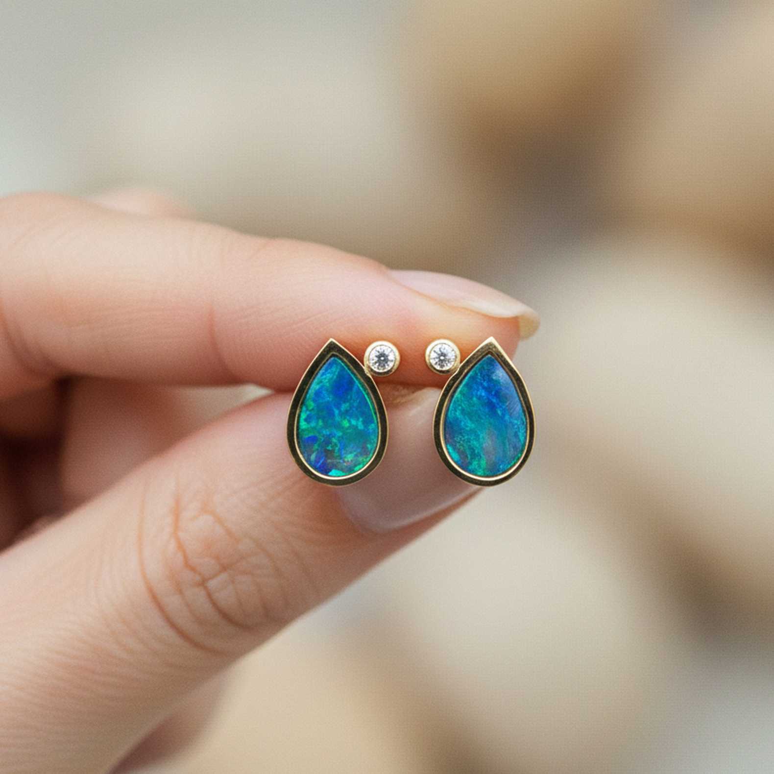 Pendientes de oro amarillo de 18k, dos diamantes naturales talla brillante y dos ópalos doublet.
