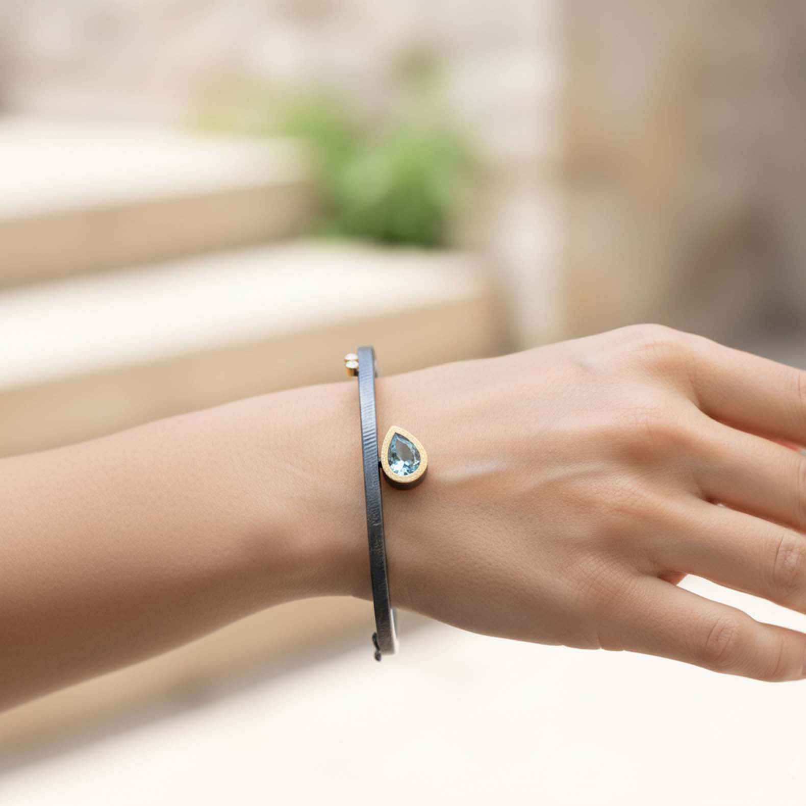 Polsera de plata, or groc de 18q, dos diamants naturals talla brillant i un topazi blau.