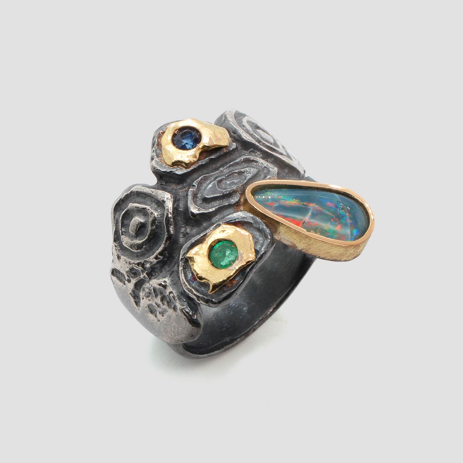 La natura de vegades ens sorprèn amb un magnífic òpal doublet; la plata, l’or groc de 18q, un safir i una maragda rematen aquest anell únic.