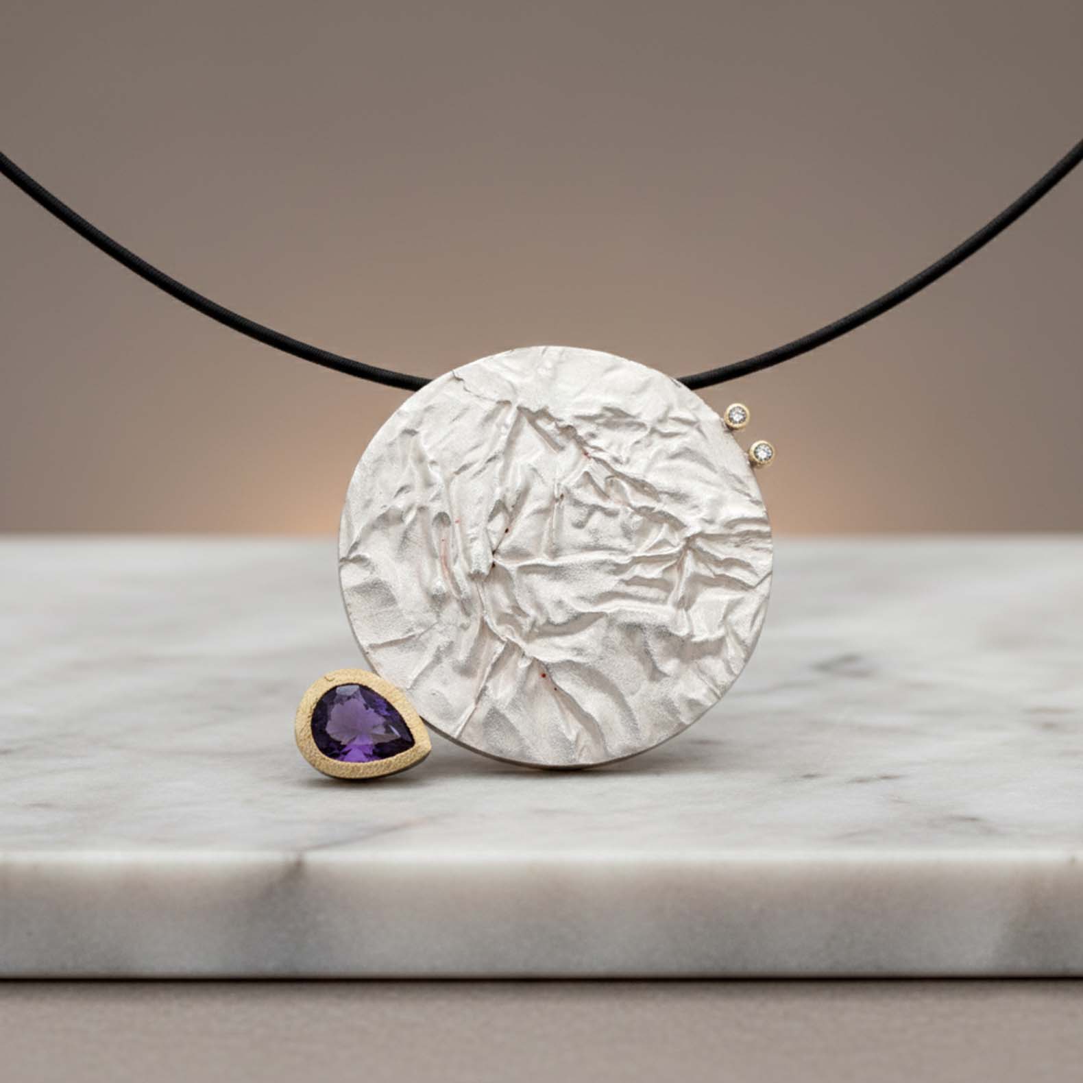 Penjoll de plata, or groc de 18q, dos diamants natruals talla brillant i una ametista.