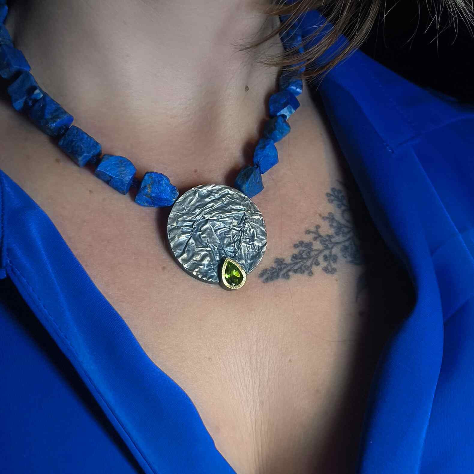 Collar de plata, or groc de 18q, lapislàtzulis i un peridot de la Xina.