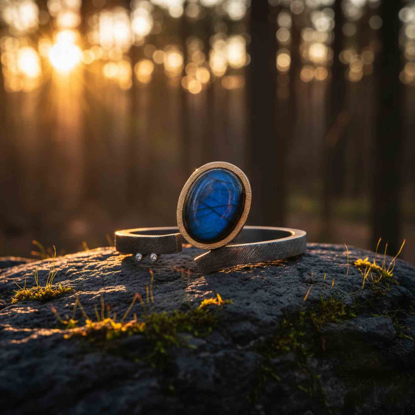 Espectacular polsera de plata i or groc de 18q amb una labradorita acompanyada de dos diamants tall brillant..